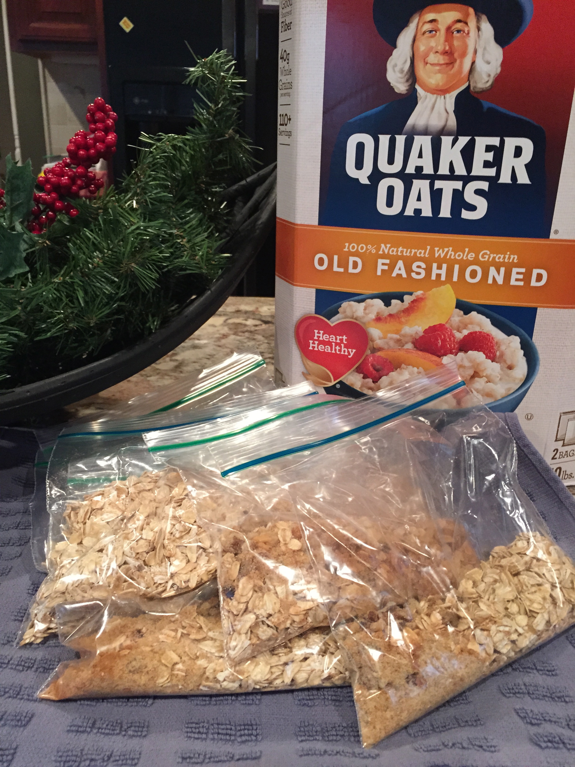 Homemade oatmeal bags delivered in a snowman canister as cute little Christmas gifts. You’ve already used up the oatmeal, might as well reuse the container! (See, now I’m getting back into the eco-friendly mindset!)